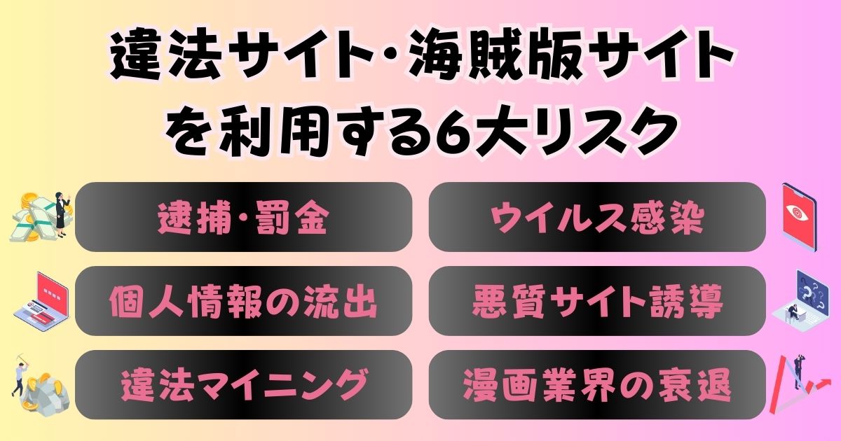 なぜなら、違法にアップロードされたサイトで作品を閲覧するのは、著作権を侵害する行為であり、様々な危険が潜んでいるからなんです!